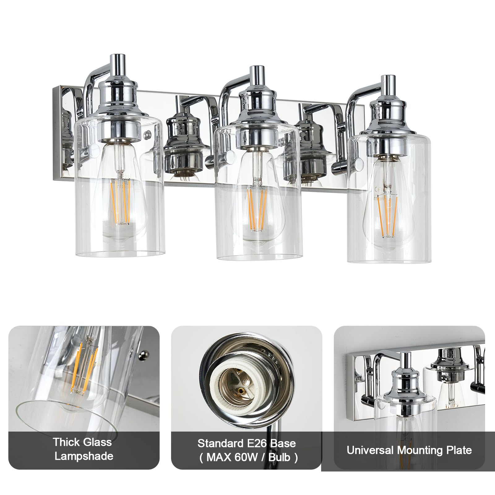 - 【US E26 Socket:】Vanity lights for bathroom Bulb Specifications: 3 x E26 base bulb(Max.60W). (Bulb NOT included). Available bulb type: incandescent, LED, or CFL bulb.