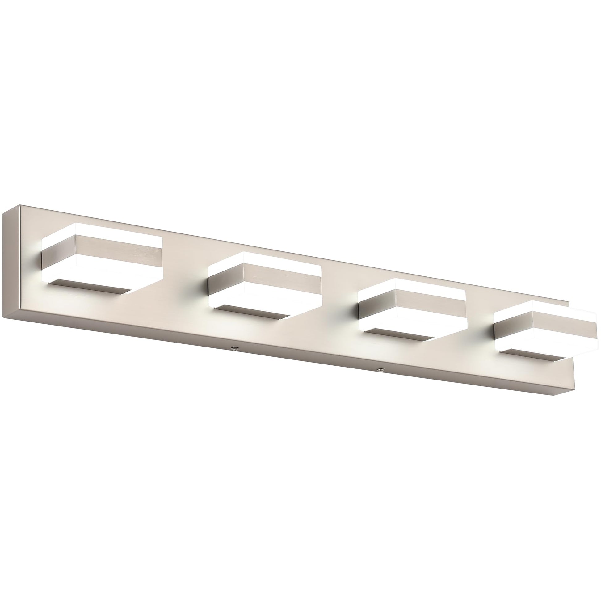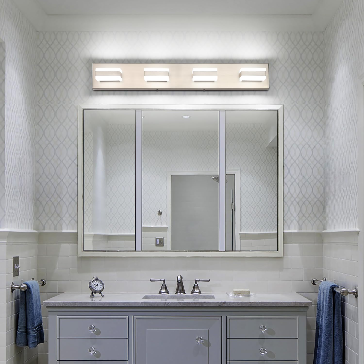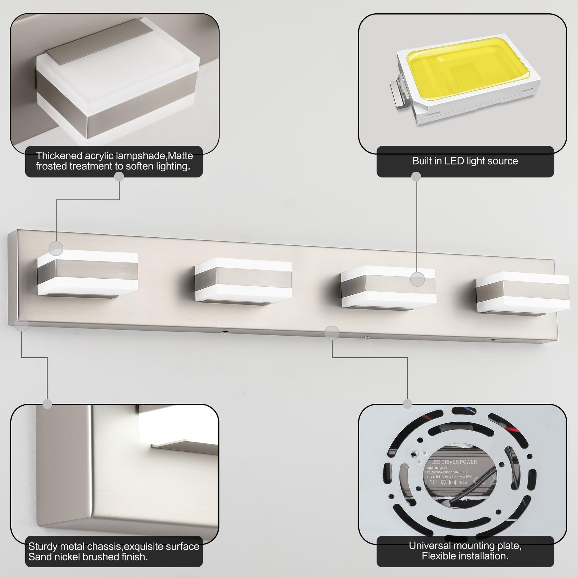 - 1.【EASY TO INSTALL】15-Minutes Easy Installation, LED 32 watts, hardwired, no assembly required, USA standard back plate. This modern nickel dimmable 4-light bathroom light fixture directly connects to the reserved wire, and then mount to the wall.