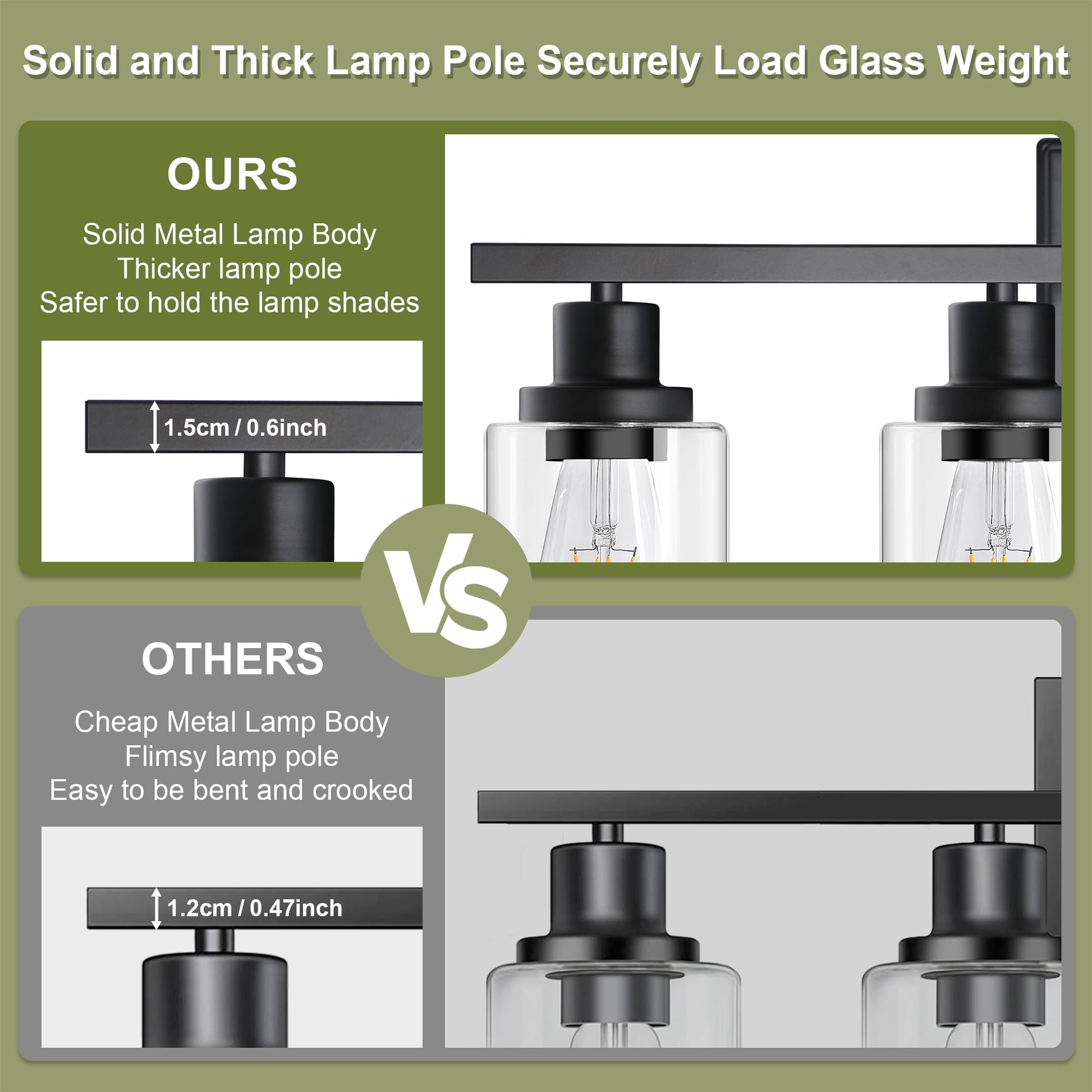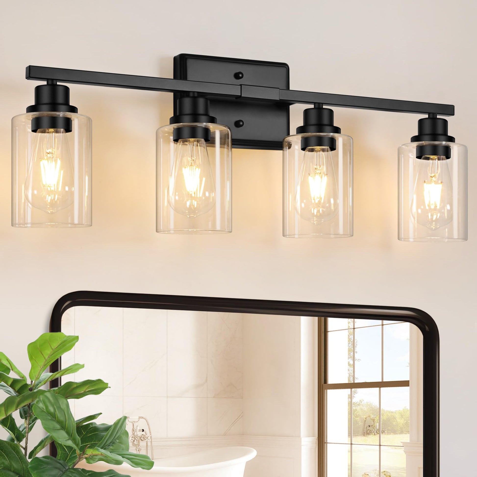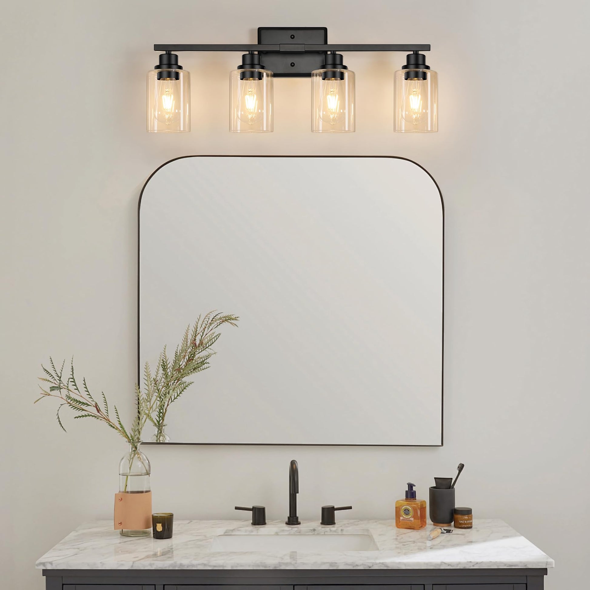 - Modern Minimalist Design: This 4-light bathroom light fixture features matte black finish lamp frame and clear glass shades,which is suitable for various decoration styles. A perfect choice to enhance aesthetics for bathroom remodel.